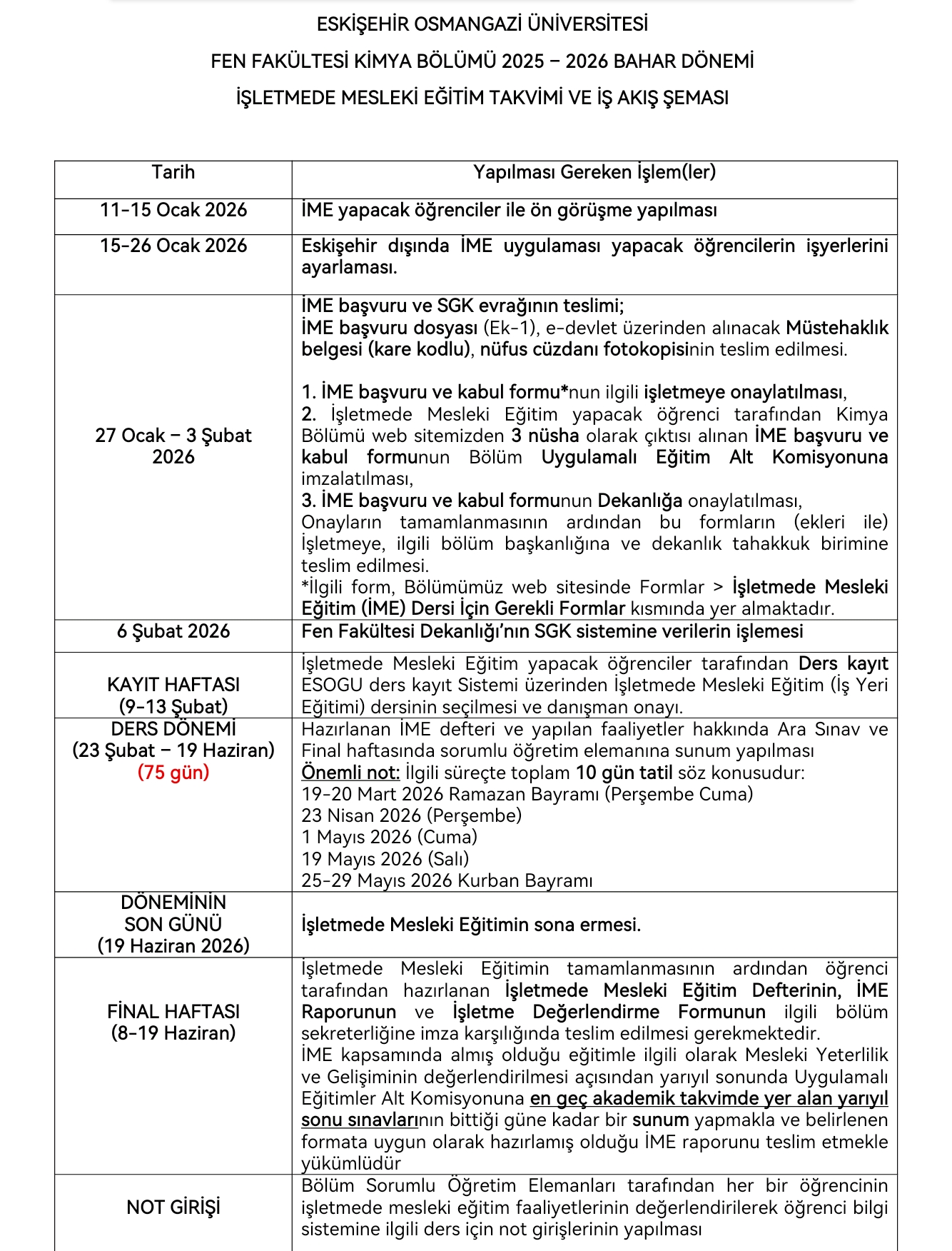 2025-2026 Eğitim Öğretim Yılı Bahar döneminde İşletmede Mesleki Eğitim (IME) dersini alacak öğrencilerin en geç 14 Ocak 2026 Çarşamba günü saat 24.00’a kadar ikiran1971@gmail.com e-posta adresine taleplerini bildirmeleri gerekmektedir.